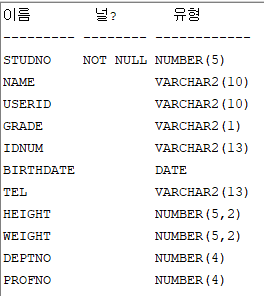 학생 테이블 인스턴스 & 예제 데이터 칼럼이름 데이터 타입 key type NN/ Unique FK tabel FK column 설명 STUDNO NUMBER(5) PK NN,U 학번 NAME VARCHAR2(10) NN 이름 USERID VARCHAR2(10) 사용자 아이디 GRADE VA..