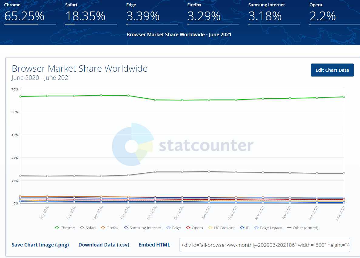 2020-2021년 7월 현재까지는 크롬이 제일 많이 사용되는 것을 볼 수 있다 이 외에도 Edit Chart Data로 원하는 트래픽을 볼 수 있다.