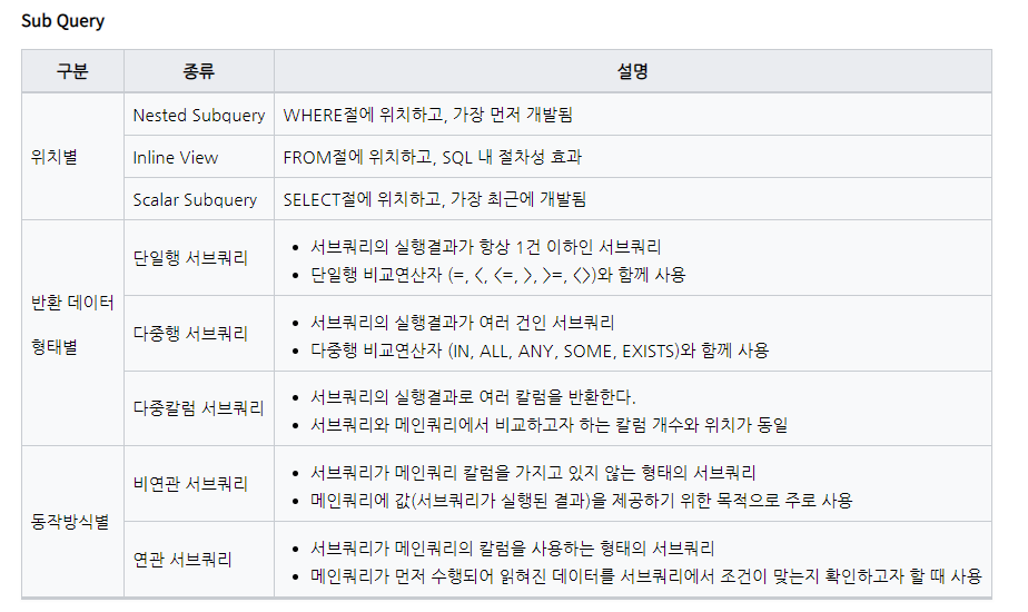 –하나의 SQL 명령문의 결과를 다른 SQL 명령문에 전달하기 위해 두 개 이 상의 SQL 명령문을 하나의 SQL명령문으로 연결하여 처리하는 방법