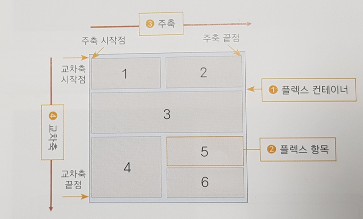 2. 플렉스 항목(flex item) - 플렉스 컨테이너에 담기는 웹 요소입니다. 위의 그림에서 1~6번 항목이 해당합니다.