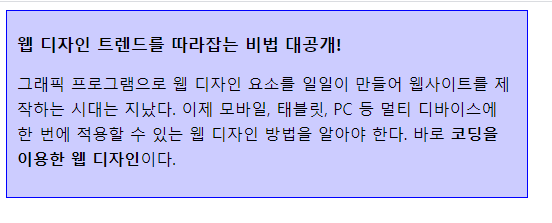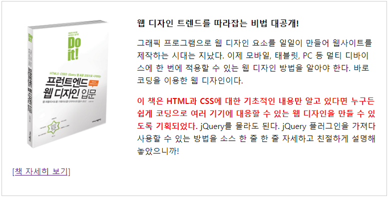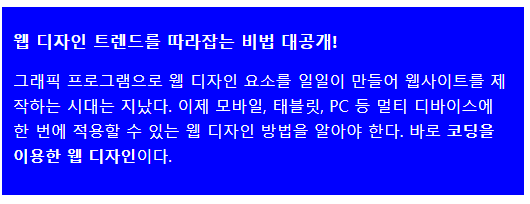 <p>그래픽 프로그램으로 웹 디자인 요소를 일일이 만들어 웹사이트를 제작하는 시대는 지났다. 이제 모바일, 태블릿, PC 등 멀티 디바이스에 한 번에 적용할 수 있는 웹 디자인 방법을 알아야 한다. 바로 <b>코딩을 이용한 웹 디자인</b>이다. </p>